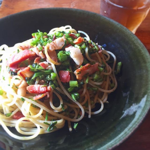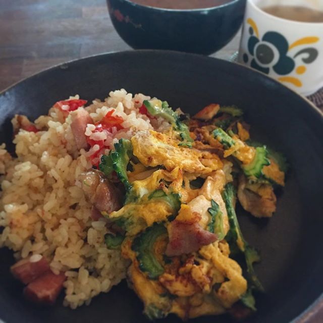 2017年8月6日2017年9月5日 夏の朝ごはん、豪華版!宴会の残り物の、トマトとベーコンの炊き込みごはん。これ爽やかで良い!そして私は毎日食べても良い好物、ゴーヤチャンプル!お味噌汁とミント緑茶。このミント緑茶をメニュー化しようと思っているうちに、夏が過ぎていく… permalink