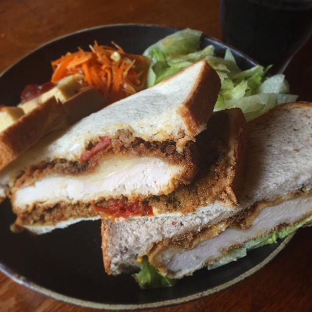 2017年8月14日2017年9月5日 お盆休み初日のお昼。お店の残り物お片付けシリーズ、チキンカツカレーのお肉でカツサンド。一つはレタスマヨネーズと合わせて、一つはお店のキーマカレーと一緒に挟んでみた!人参とくるみのシークワーサーマリネとレタスのサラダ。 permalink