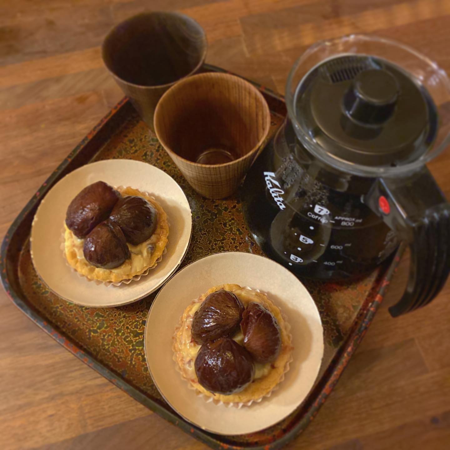 予約必須の、圭子ちゃん@こいけ菓子店特製栗のタルト。大家さんヒロヤショップに栗が出始めると、圭子ちゃんと2人で「来たよ栗!」「来たねえ!!」と確認しあって、始まる栗メニュー。コレを食べなきゃ秋が始まらないし終わらない?!早速予約していただきます。コーヒーは歳若き素敵な友人トコチからのお土産、北海道は石田珈琲店の季節のブレンド。今日は北から南から、素敵な友人に感謝。
