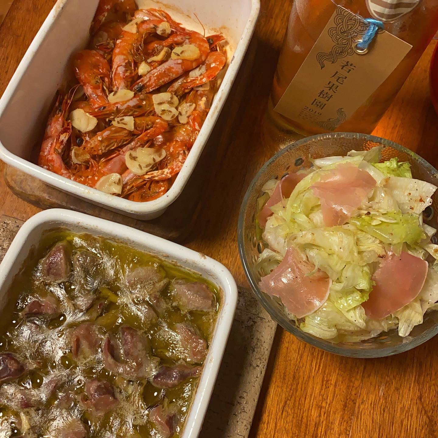 いつもいつも作りすぎるから、まずは前菜だけで飲み始める作戦。砂肝のアヒージョ、レタスと生ハムのサラダ、沖縄はひばり屋さっちゃんが16周年のお祝いに送ってくれた冷凍車海老小さいやつもアヒージョに。ワインはキッチンスタッフナベさんが誕生日祝いにくれた日本ワイン、若尾果樹園2019。しっかり深く美味しい。