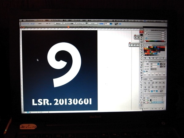 というわけで、当店店名を省略した「LSR.」と9周年記念日の「20130601」はGill Sans書体にちょこちょことうまいこと橋渡しを出して、ステンシル用に整え......メインになる「9」は.....そもそも既成のフォントから作らず、Illustratorのツールを使ってぐるんと渦巻きを描いたものを整え.....そんなかんじでなんとか完成.....いやいや、あまりにシンプルすぎて、コレで大丈夫かね??(苦笑)
