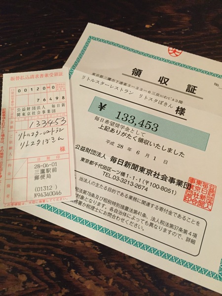 前回から2年とちょっと間が空いてしまいましたが、先日の5月31日に当店の小さな募金は「リトスタぼきん。」、今回も「毎日希望奨学金」に振り込んでまいりました...って、今回で3回目の振込となるんですが、えぇ、実は前回に続いて(おそらく)振込の時の本人確認証明書を持参し忘れ、あわててお店に取りに帰るなんてことをしてしまいましたが、えぇ、ここに書いておけば次回はきっと大丈夫だろうと(苦笑)。