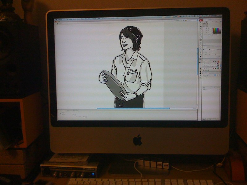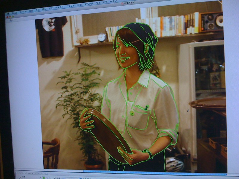 とまずは「ウラ★スタ」でもアップしました、新人ホールスタッフのおすぎのイラストからやってみましょうか。使うソフトはAdobeのFlash(うちはCS3)。僕はFlashはバージョン2の頃から使ってますが(その頃はもちろんデザインの仕事もしてませんでした。)、アニメとか、動画とか、ゲームとか....ホントに今やあらゆる素材をインタラクティブに構築できるソフトでありながら、えぇ、ワタクシこのような単純なイラスト画きにしか使ってないのであります(笑)。