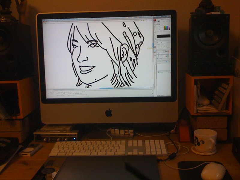 えっと、実は先日の定休日に銀座のアップルストアで催されたイラストレーターで当店お客さん、たかしまてつをさんのペンタブレット講座を見に行きまして、そこですっかり刺激を受け、今回のこのイラスト仕事、えぇ〜い景気づけだ!と購入しましたWACOMの最新のタブレット「Intuos4」を使って参ります。いやカスタムの設定をすると(そしてそれに慣れると)、すごく使いやすく作業のスピードが上がること間違いなし.....のような気がします(笑)。