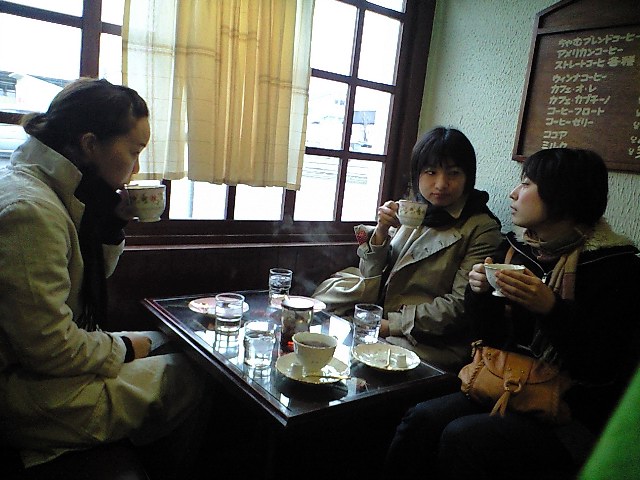 大津港駅まで送っていただいて、電車の時間まで駅前の喫茶店でサイフォンで淹れたコーヒーをいただいております。(お)