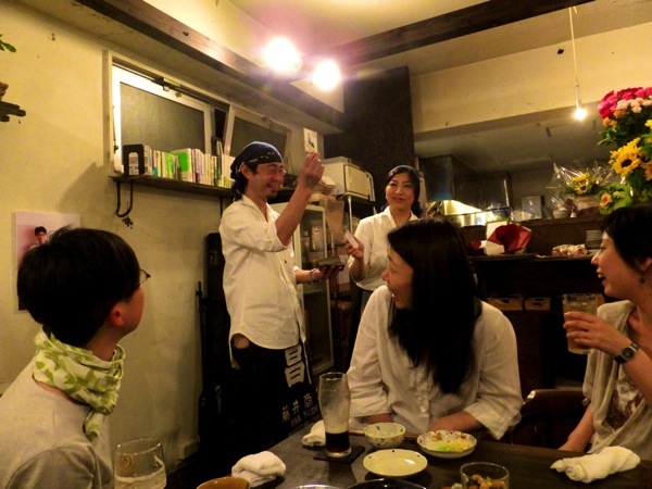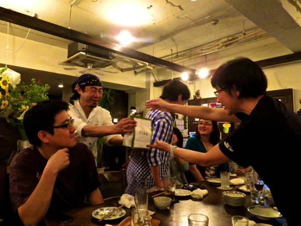 あー、それは昨年迎えた当店祝!10周年は6月1日の日曜日.....お天気もよく、三鷹は30℃越えの真夏日....お昼時からわいわいとたくさんのお客さんがご来店、お祝いをいただいたり声をかけて下さったり.....夜もちょこちょこと予約が多くて.....えぇ、当日のブログによると終日賑やかだったようでありますが(笑)、えぇ、日曜日の夜、いつもより1時間早めの閉店.....って、やっぱりね、さすがに今年は10周年、ワタクシドモスタッフもいっしょに乾杯しましょう!とおなじみのお客さんのみなさん.....すっかりお祝い酒までご用意して残って下さいまして(笑)、乾杯準備に慌ただしい閉店後.....