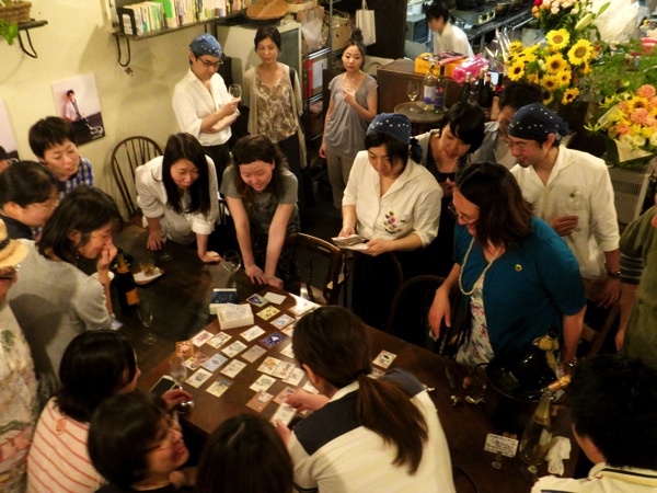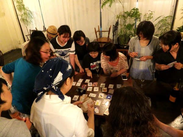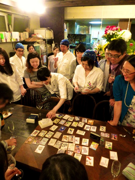 みんなで大笑いしながら順番に読みつつテーブルに並べ.....参加のみなさんにとっても、こうして「リトスタかるた」の全貌は初披露!....愉快な詠みネタに思いがけない絵柄等々....「この絵描いたの誰〜?」なんて盛り上がりに盛り上がる!(笑)