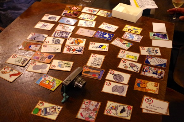 どれどれと.....大ネタコネタに裏ネタと当店にまつわるあれこれ読み札、ほぼ全てはまるっとチカコさんご自身が詠んで下さったもの。そしてざっくばらんに十人十色な絵札は.....今夜お集まりのお客さんに元スタッフがそれぞれ担当して書いて下さったもの.....そう、今夜残って下さったお客さんは、その「かるた」に参加して下さったみなさん!(だからこんなにたくさんなのね!....笑)