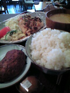 今日のランチは早い時間からたくさんのお客さんにご来店いただき…しまいには、豚肉の香味焼き定食のみになってしまいました。みなさんにはご迷惑をおかけしました。 ということで、ワタクシの賄いは鶏のから揚げ・中華香味だれ(ミニハンバーグつき)…って、やっぱこれじゃ痩せないね(苦笑)(お)