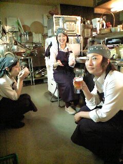 土曜の夜、慌ただしい前半戦を戦い抜いた厨房・乙女組…ご注文キャンセルになった生ビールで喉潤し中、くろちゃんはホットミルク、ガヮちゃんは…猫舌でまだミルクがのめないのでした(苦笑)。(お)