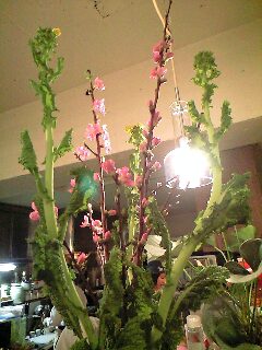 桃の節句にちなんで、桃の花と菜の花を飾ってみました。おひな様も春らしく華やぎますね。(お)