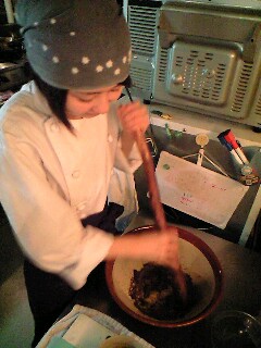 その焼いたふきのとうと味噌を合わせて練っていきます…ガヮちゃんが今日はがんばってくれておりまして、えぇ、本日もおいしくお召し上がりいただけます、自家製ふき味噌。ぜひ!(お)
