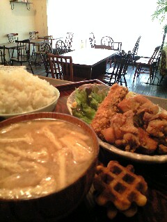 ワタクシokayanのお昼の賄い…鶏のから揚げにいわしのマスタードフライがちょっとついて、おやつは週末に来てくれた、店長ミヤザキの旧友、アヤコちゃんからおみやげにいただいたガレット。ごちそうさまです。(お)