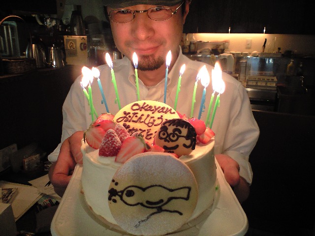 完全ワタクシ仕様、モリスケさん特注のバースデーケーキ…細工が凝っております、えぇ、実物より髪が多いって!?(苦笑)。 本日ティタイム、お馴染みの男性のお客さんにプレゼントしていただきました、えぇ、予告通り…ありがとうございます。いや、しかし、バースデーケーキ…10年振りくらいか?この歳で…って、ホント感激しました!(お)