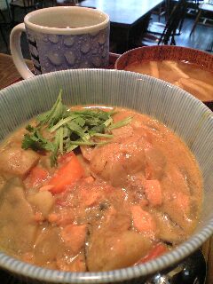 本日の昼の賄い…鮭のミルクカレー(丼)。只今他力本願的プチ・ダイエット中のワタクシ(人にごはんを盛ってもらう)、ごはんの量は180グラム…そのくらいにしといたる!(苦笑)(お)