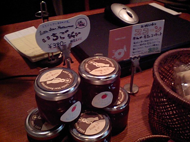 おうち用に作ったいちごジャムを、おすそ分けで販売してます!限定6個…もう1個お買い上げいただいたので、あと5個です。店長ミヤザキ特製、サラリとしたいちごジャム、お早めに!(麻)