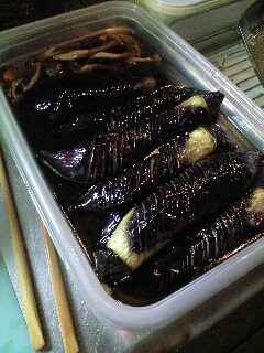 明日のランチの揚げびたし…メインもいいけど、とにかく茄子がおいしそう。きちんと切り込みを入れて、さっくり素揚げにしたら、やさしい味のだし汁に漬け込みます。しっかり旨味がしみこんで、明日のお昼が楽しみです。(お)