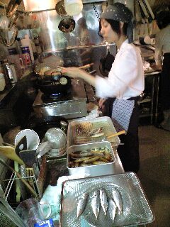 店長ミヤザキがぜいごとえらを取って下ごしらえした小アジ…今度はくろちゃんが次々とから揚げにしたら、さっくり南蛮だれに漬け込んでいきます。ということで、本日小アジの南蛮漬け、おすすめですよ!(お)