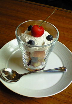 ブルーベリーのトライフル。生とジャムにしたブルーベリー、ヨーグルトパウンド、メイプルシロップに生クリーム、仕上げにさくらんぼをのせて。小さいけれど、盛りだくさんのスイーツです。(圭)