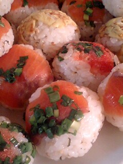 貸し切り宴会でお出しした手まり寿司!たまごとサーモンです!(麻)