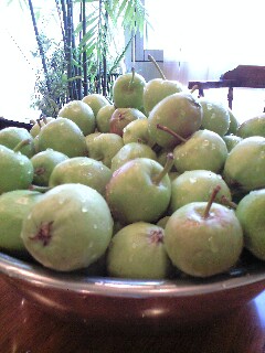うちのビル1F、ヒロヤショップさんにお願いして、市場で集めてきてもらった姫りんご。さ、アレ、いきましょうか!(お)
