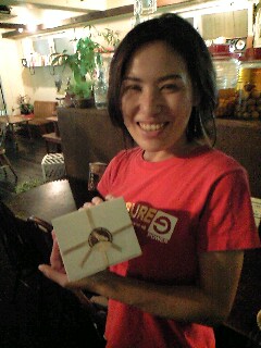 当店ホールスタッフのタカダネェサン、今月海の日に祝!お誕生日!ということで、フカザワ特製リトルスターのシナモンクッキーにスタッフみんなで書いたメッセージカードを添えて!おめでとう!(お)
