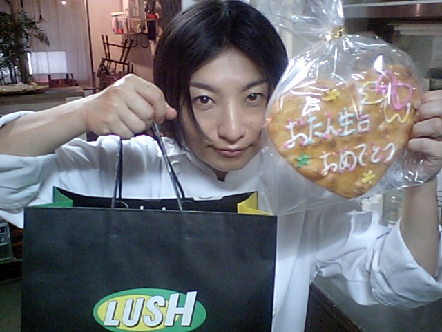 友人とお客様にプレゼントいただきました!バスタイムセットとメッセージ入りおせんべい。ありがとうございます〜(麻)