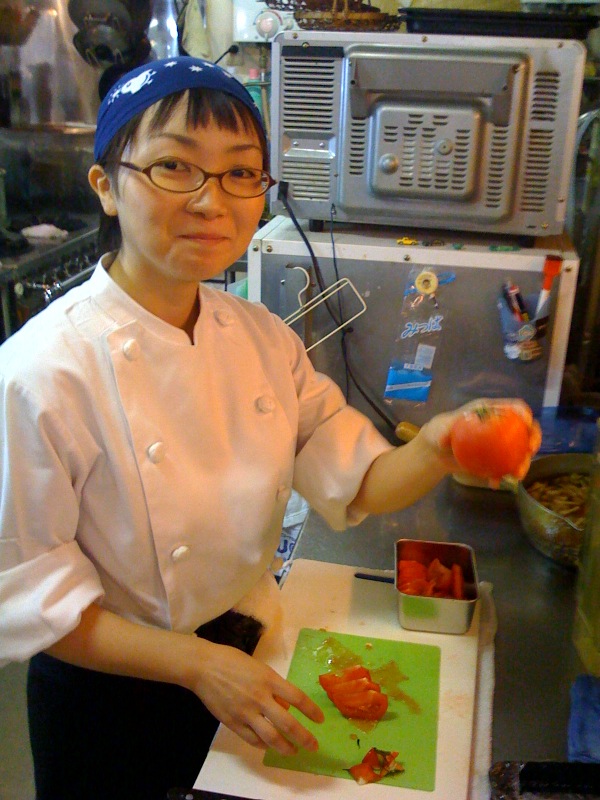 はまこ、本格的にデビューということで、料理人の証しコックコートに袖 を通す…や、やっぱちょっと大きいか?(笑)ま、だんだん板についてく るということで、ハイ。(お) で