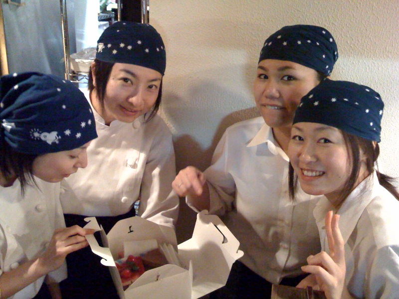 昨夜仕事で三鷹に来たんで~とご来店いただいたのは、なんと寿退社した清水さんのダンナさん、ケンタロー君ではありませんか!と、しっかりおみやげいただきました(笑)。というわけで、ケーキに華やぐ女性陣…また、よろこばしからずや。ありがとね~!(お)