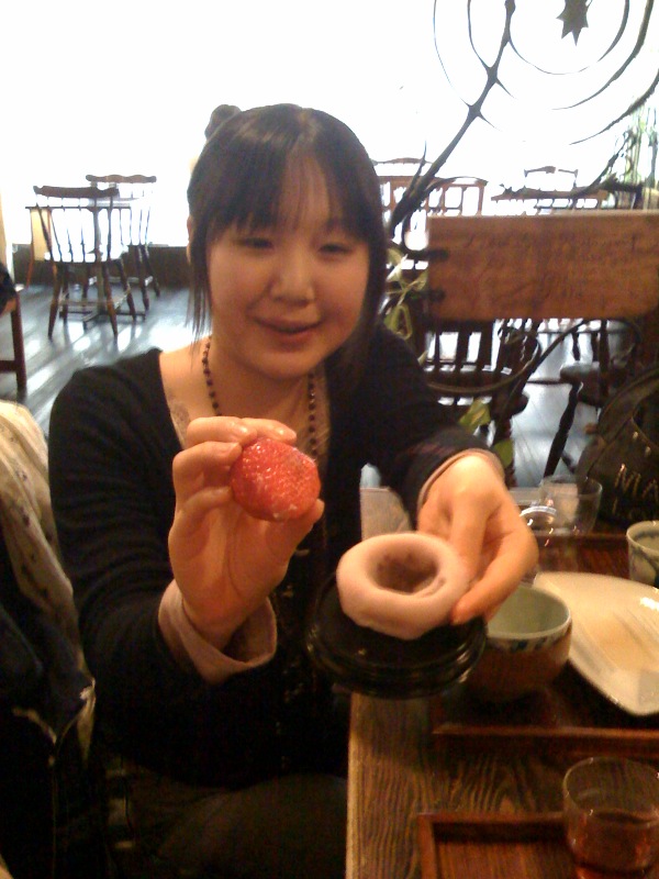 さっき「風のすみか」さんまで毎月新聞を配達に行ったついでに、中央通 りの市村屋さんで桜もちを購入。ホントは無類の道明寺好きなワタクシで すが、たまにはね、関東風の桜もちもいただきましょう…モデルははま子 さんにお願いしました(笑)。(お)