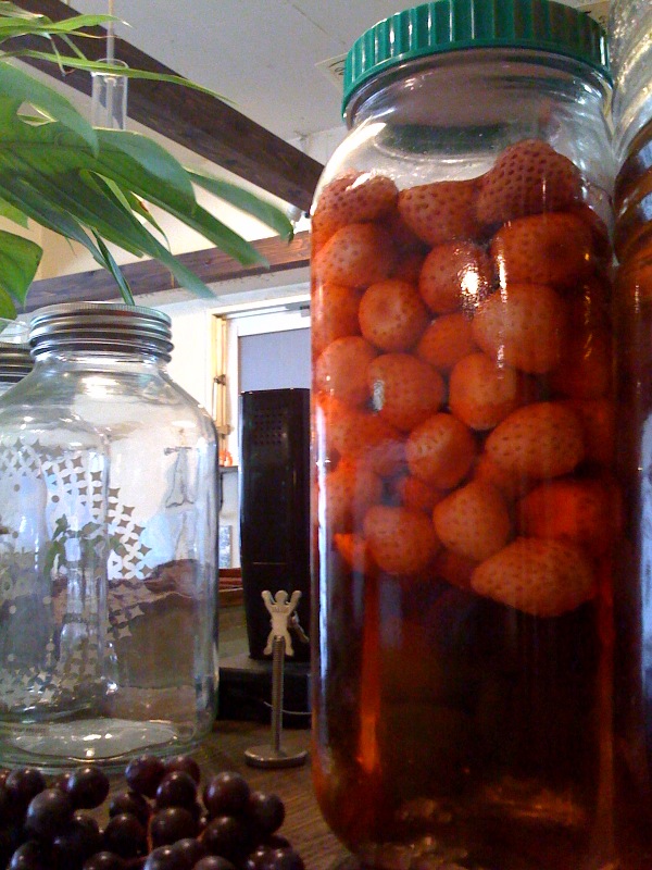 先週末にアッキーが漬けてくれたいちご酒…すでにだいぶ色づいてきまし たよ。これからひと月、じっくり漬け込んで、登場はGW明けの予定 であります…お楽しみに!(お)