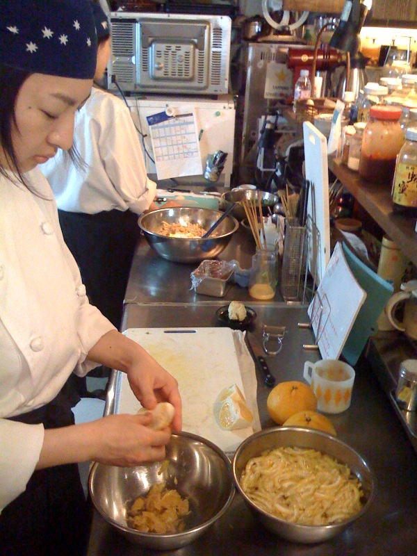 昨日と同じアングルで…店長ミヤザキは無農薬の夏みかんで自家製マーマ レイド作り、奥のくろちゃんは付け合せのマカロニサラダを作っておりま す。(お)
