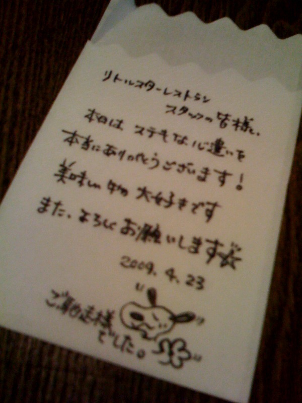 こんなすてきな置き手紙を残して下さってありがとうございました…お友 達のご結婚の小さなお祝の会、楽しい夜になって、僕らも本当にうれしい です。また、みなさんでご来店、楽しみにしております。(お)