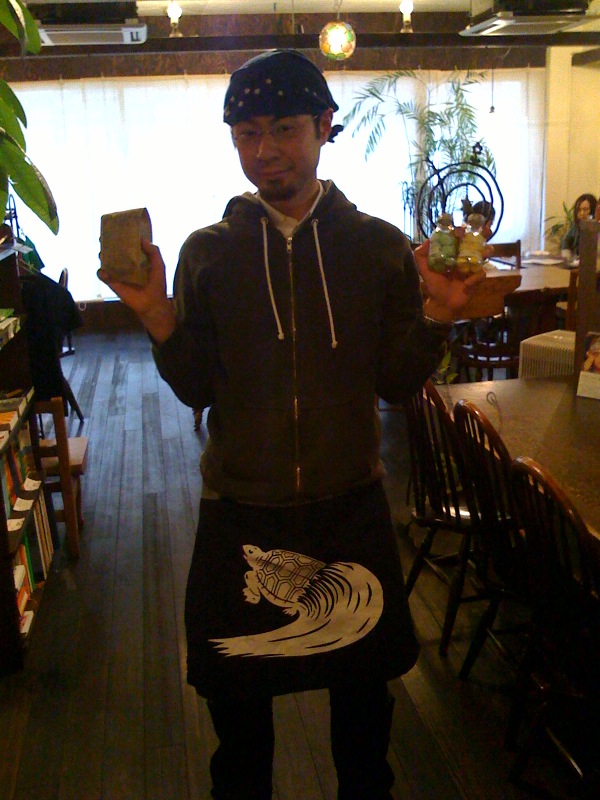 少し前に、アッキーがプレゼントしてくれたすてきな前掛け!亀の図案が 染め抜かれたショート丈の前掛け!実は裏は波の模様が抜かれてて、非常 に凝った一品であります。アッキーありがとう!(お)