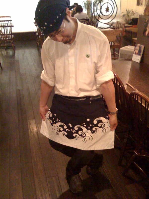 波男…実はアッキーからもらった新しい前掛け、裏面はオーソドックスな 波の図案!一枚で、二倍おいしい!…イイネッ!(お)