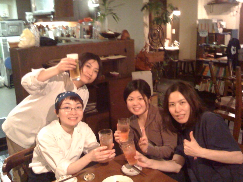 一週間お疲れさまでしたと、みんなで一杯のみましょうよ、そうしましょ うよ。ワコちゃん、ねぇさん、はま子さん、女子らしく、いちご酒でカン パイ!店長ミヤザキとワタクシは言わずもがなの生ビール!(お)