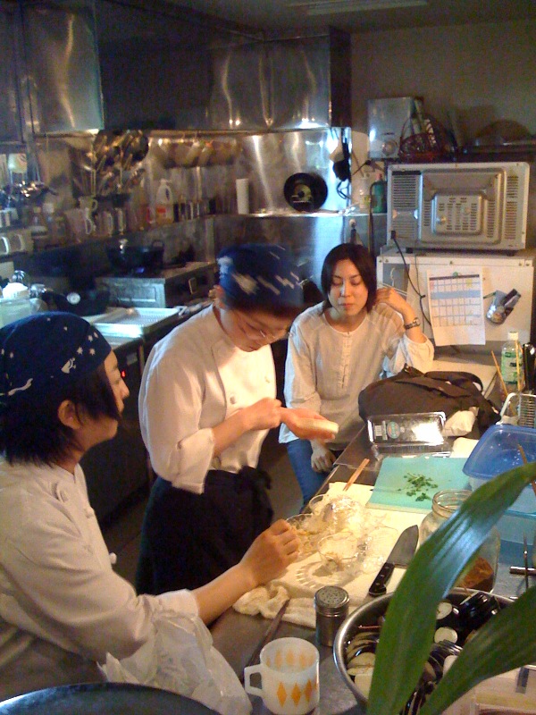 月末の5周年記念イベントのためのメニューをあれこれ試作中のキッチン スタッフのみなさん…はま子も先輩にアドバイスしてもらいながらがん ばっておるのであります。(お)
