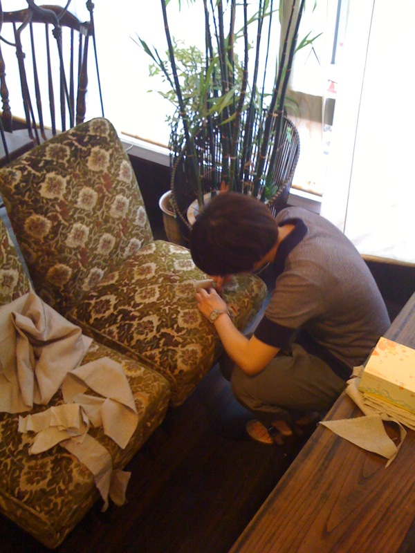 毎週定休日はなんだかんだでお店に来ることの多いワタクシたちオーナー夫婦 ですが、今日はキッチンスタッフのはま子が、当店では大人気…でもかなりく たびれきったソファの修繕をこつこつやってくれております。服飾の専門学校 に通ってただけあつて、こうゆうの得意なはま子、ありがとう。助かります。 (お)