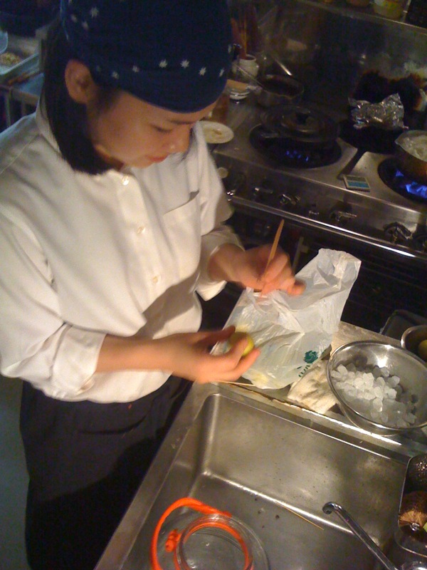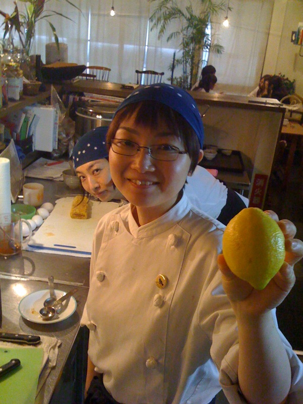 日付変わって本日7月3日、当店キッチンスタッフはま子、当店に お勤めするようになってはじめてのお誕生日を迎えました!(パチパチ)とい うことで、レモンを手に、某テレビ情報雑誌のようなはま子さんでございまし た。おめでとう!(お)