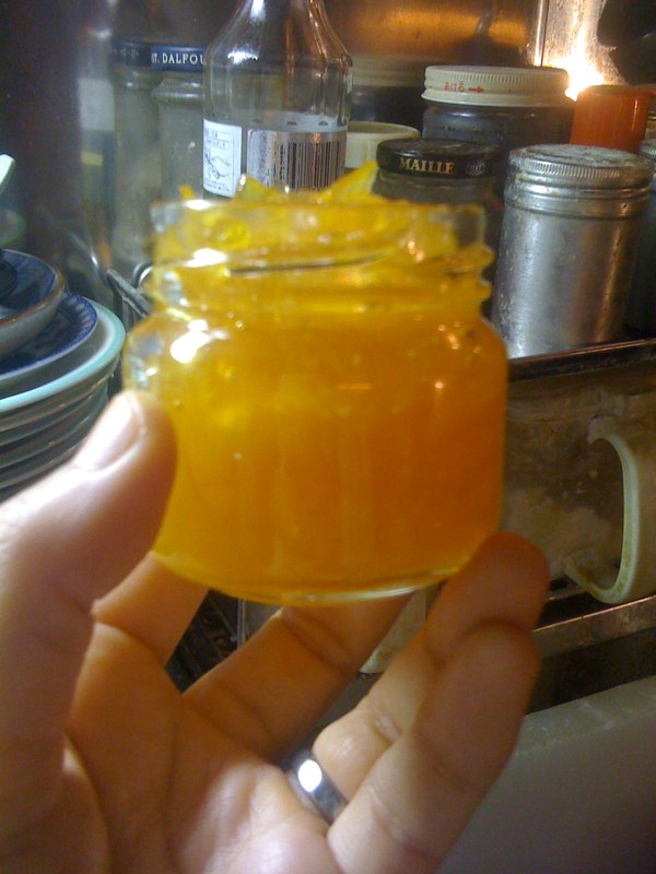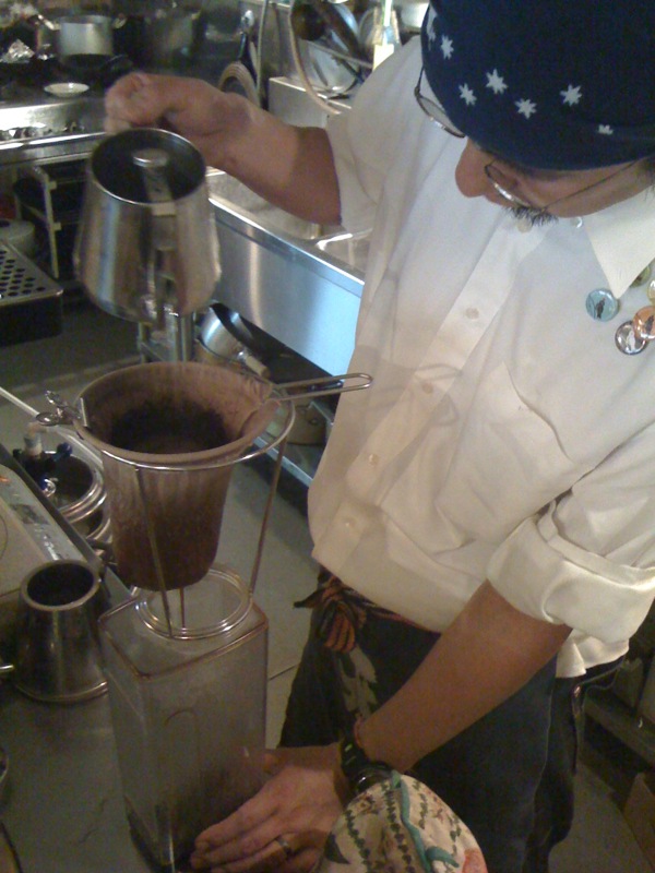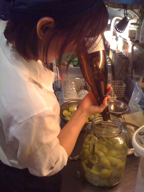 梅酒ばっかりもなんなんで(苦笑)、季節がらここんとこ人気のアイスコーヒ ー。ブレンドを淹れる時に使う小さなやぐらをひっくり返して、保存用容器の 口に取り付けて(これがピッタリ!)抽出しておる次第でございます。(お)