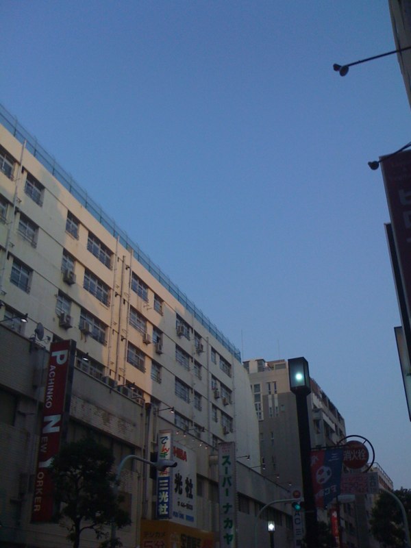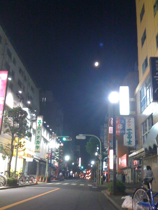 あぁ、いいお天気、気持ちいい夕暮れ時になりましたね~の三鷹駅南口中央通り…写真でも撮ろうかなと、iPhoneを向けたちょうどその時、フルーツの一富士さんの前の水銀灯、ぽつんと淡い青い灯りが点きました。