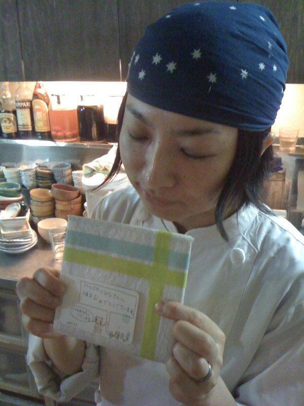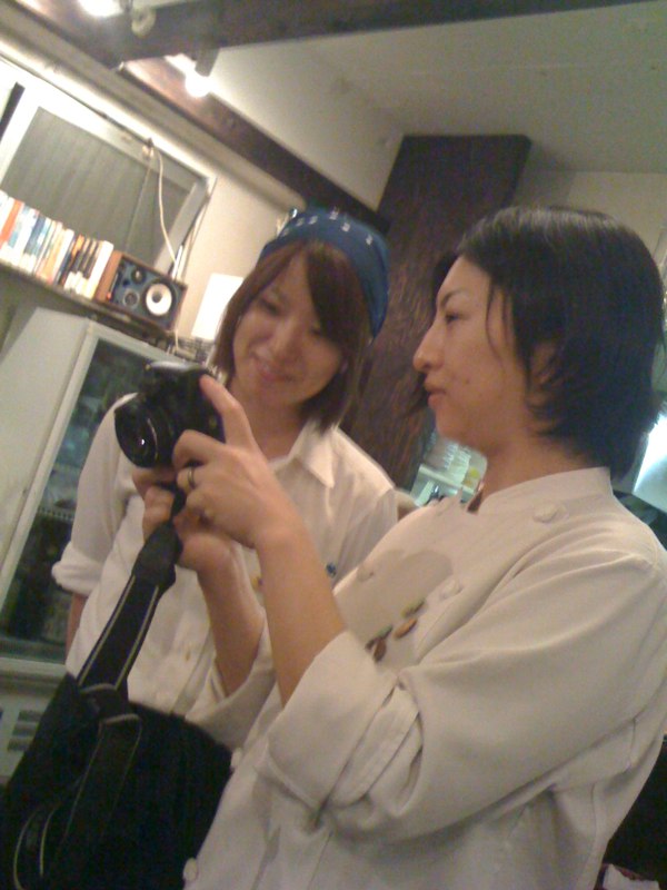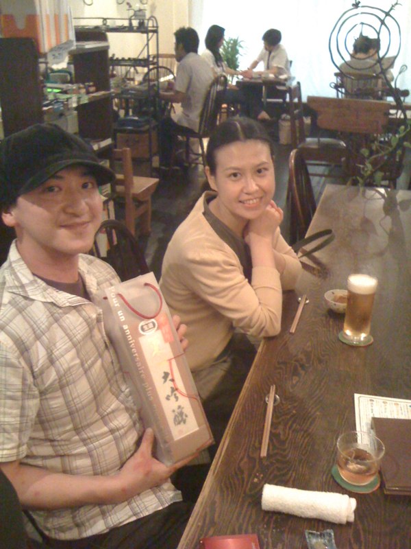 遅ればせながら~と、当店五周年のお祝いを携えて、元キッチンスタッフのヒデキがご来店…と、ちょうど夜の納品に来てくれた元オーナのフカザワ(こいけ菓子店)と、いやいやそれではちょっと一杯、楽しくひっかけ中でございます。