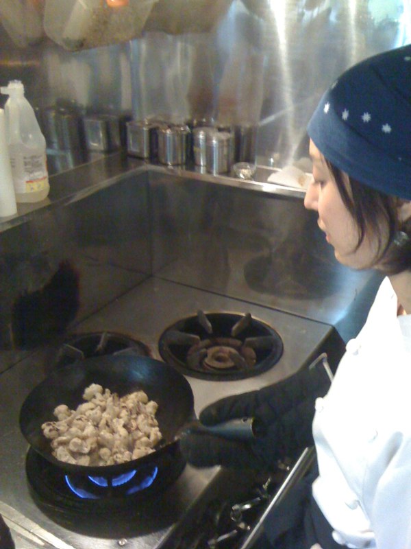 ランチにプラスの小鉢に、夜の酒の肴メニューでもおなじみ、「カリフラワーのあちゃら漬け」。カリフラワーは茹でるのではなく、こうして中華鍋でせっせと香ばしく焼き付けて、最後にじゃじゃっと甘酢で味を含めていく…くろちゃん、任せましたよ!(お)