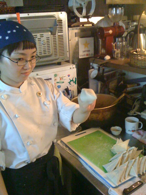 先日のお休みに散髪に行ってきたはま子さん、思い切って前髪ぱつんぱつん、襟足バリカンがイイネ!(笑) 本日おススメの「かぼちゃのサモサ風」をこれでもか!と包んでいるところをお邪魔しました!(お)