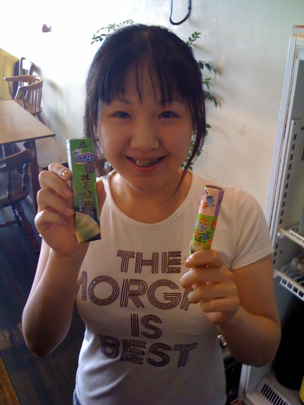 いつもよくしていただいております小学生のお客さん、想ちゃんがこの夏休み、京都にご旅行に行かれた際にわざわざ買って来て下さったのが、限定の(?)抹茶のお菓子! 当店無類の抹茶好き、通称お抹茶先輩のたしろん、もちろん大ヨロコビ!ありがとうございました。(お)
