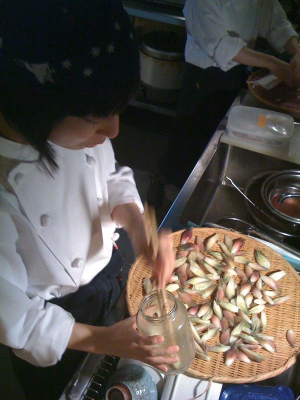 茗荷の甘酢漬け!さっくり茹がいたら、ほいほい瓶に入れて、自家製甘酢に漬けるだけ!でもコレがうまい!(お)