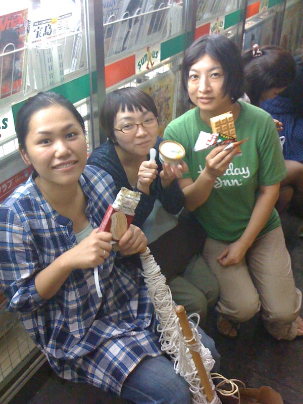 遅番スタッフの仕事上がりの溜まり場…コンビニの前のベンチでアイスクリームをたべながら、青春の話とかするんだろうねー。ということで、店長ミヤザキとワタクシも今夜は仲間に入れでもらいました(笑)。あー、もうすぐ午前3時ですが、なにか?(苦笑)(お)