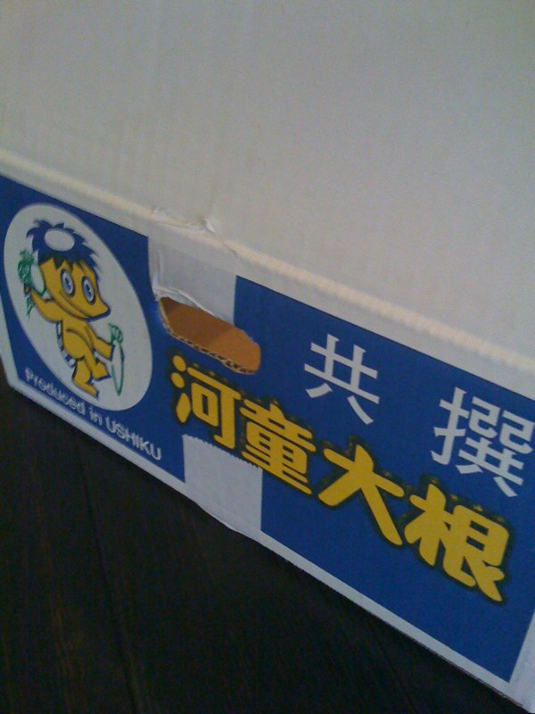 何故、河童と大根!河童と言えば、胡瓜と相場は決まっておりまっしゃろ!…って、しかも河童、大根を両手にたいそううれしそうでありますが…えぇ、見境のない世相を反映しているという訳でもないでしょうね、きっと。(笑)(お)
