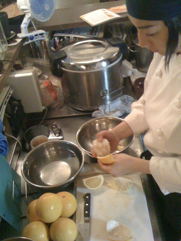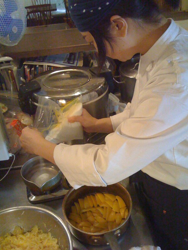 この時期旬の柑橘で、マーマレイドにあうのありませんかね~と、お隣のフルーツの一富士さんにお伺いしたら、だったら八朔がいいんじゃない!と、えぇ、店長ミヤザキ、八朔マーマレイドをこさえております。すでに出来上がりが楽しみ~(笑)。(お)