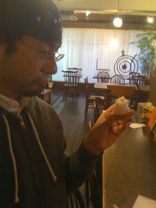 本日はお休みのおすぎがわざわざ差し入れを持って来てくれました…小さなケーキ、本日無精髭のワタクシが、この頃人気の白髭のおじさんのケーキを選んだのでありました!いただきます~!(お)